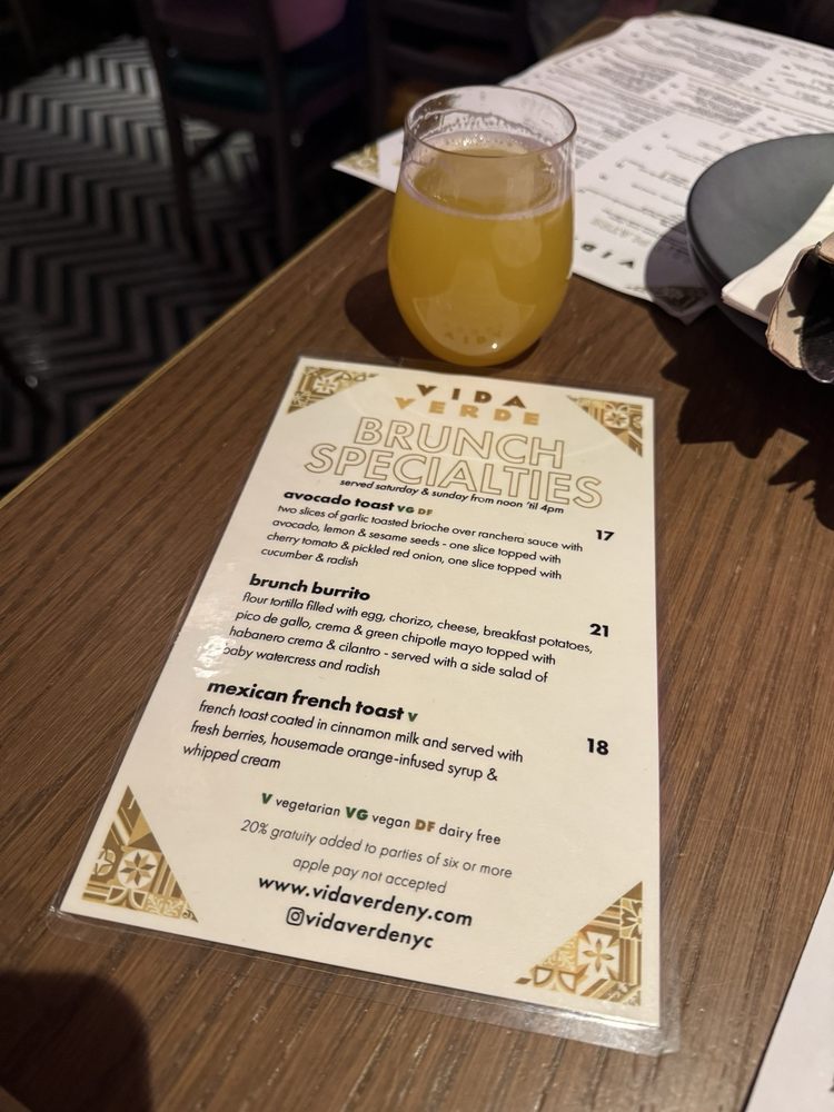 Introducing Vida Verde, a trendy and lively Mexican restaurant located in New York City. Offering a variety of options for different dietary preferences, including pescatarian and vegan choices, Vida Verde boasts a vibrant atmosphere with rooftop seating, colorful decor, and occasional live music. Their menu features tantalizing dishes such as the Birria Quesadilla, Trio of Guacamole, and flavorful tacos like pollo, al pastor, and carnitas. Customers rave about the Yucca Fries, bottomless brunch options, and creative cocktails like the mango margarita. With excellent service and a fun ambiance, Vida Verde is the perfect spot to start your night out or enjoy a bustling brunch with friends. Experience the best of Mexican cuisine with a modern twist at Vida Verde.